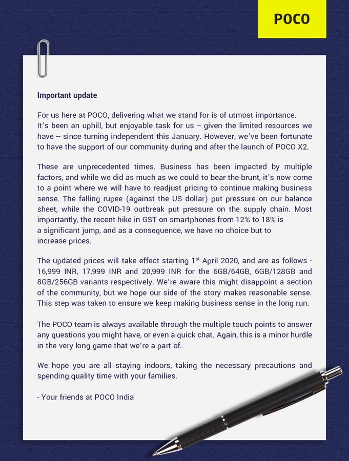 After Xiaomi’s Manu Kumar Jain announced the hike in prices from April 1st, Poco India General Manager C. Manmohan also chimed in with a hike in the prices for the Poco X2. Oppo and Realme also followed suit with announcements explaining why they have to raise prices at a time when the economy is already going to recession.