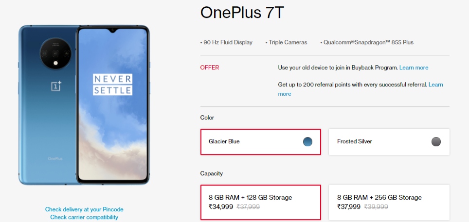The OnePlus 7T Pro (8GB + 256GB) is listed with a revised pricing of Rs. 47,999 (~$625) after an impressive price reduction of Rs. 6,000 (~$78). The 128 GB and 256 GB OnePlus 7T models are now priced at 34,999 (~$456) and Rs. 37,999 (~$495), respectively. Both models have received Rs. 3,000 (~$39) and Rs. 2,000 (~$26) price cuts, respectively.